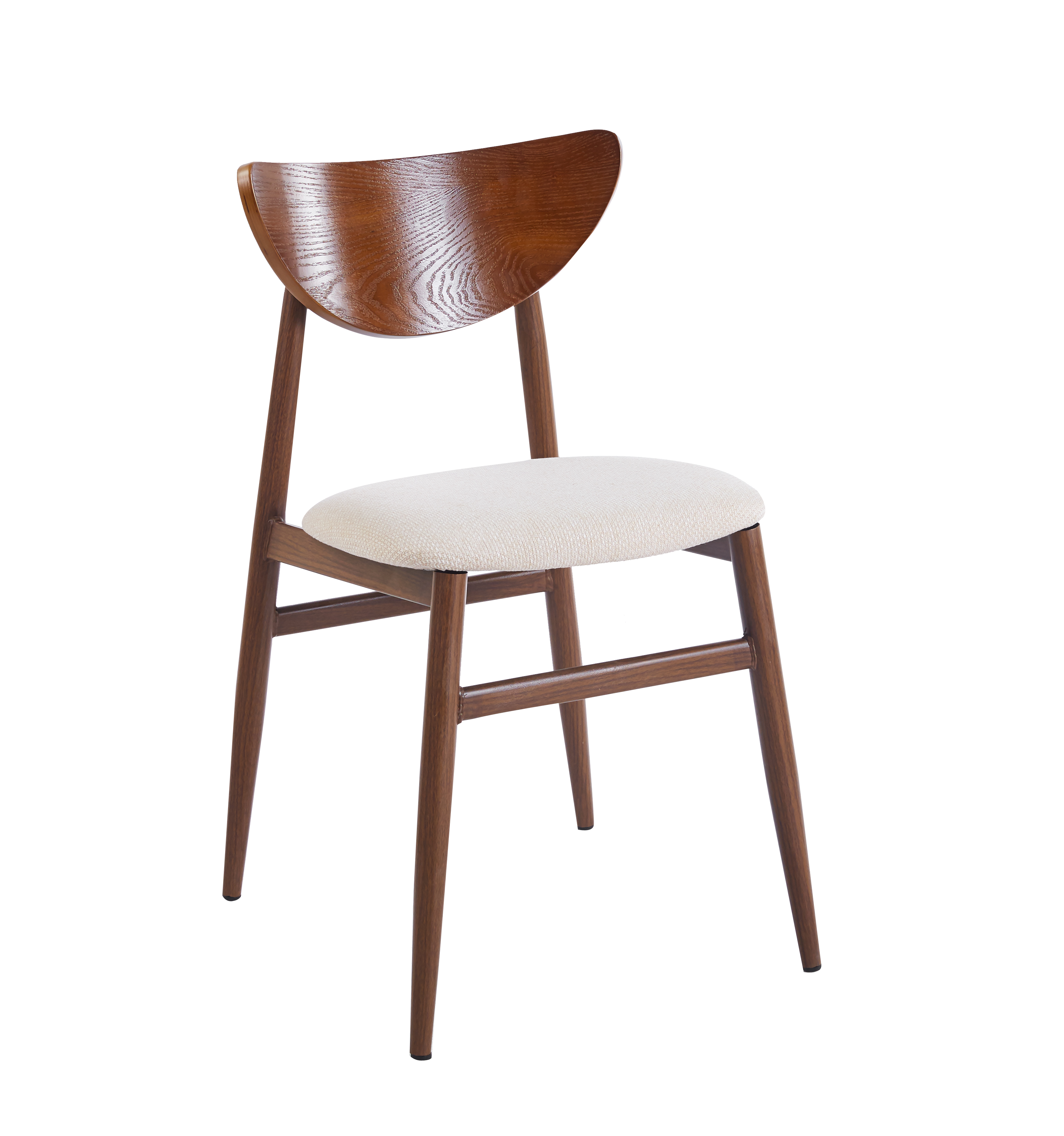 Till bordet matchar fyra Ludvig matstolar i ett harmoniskt samspel av valnötsbruna toner och beige tyg. Den mjukt stoppade sitsen ger en bekväm sittupplevelse, medan den elegant formade träryggen tillför naturlig värme och visuell balans. Stommens valnötsfolierade metall ger stabilitet och ett enhetligt uttryck tillsammans med bordets design.