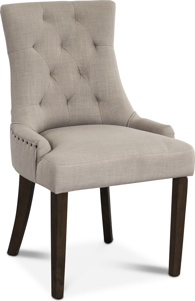 Tuva stol i beige tyg med antika nitar som en fräck detalj. Bruna ben, Stolen är välarbetad och en av våra mest populära matstolar till Vintage-stilen.