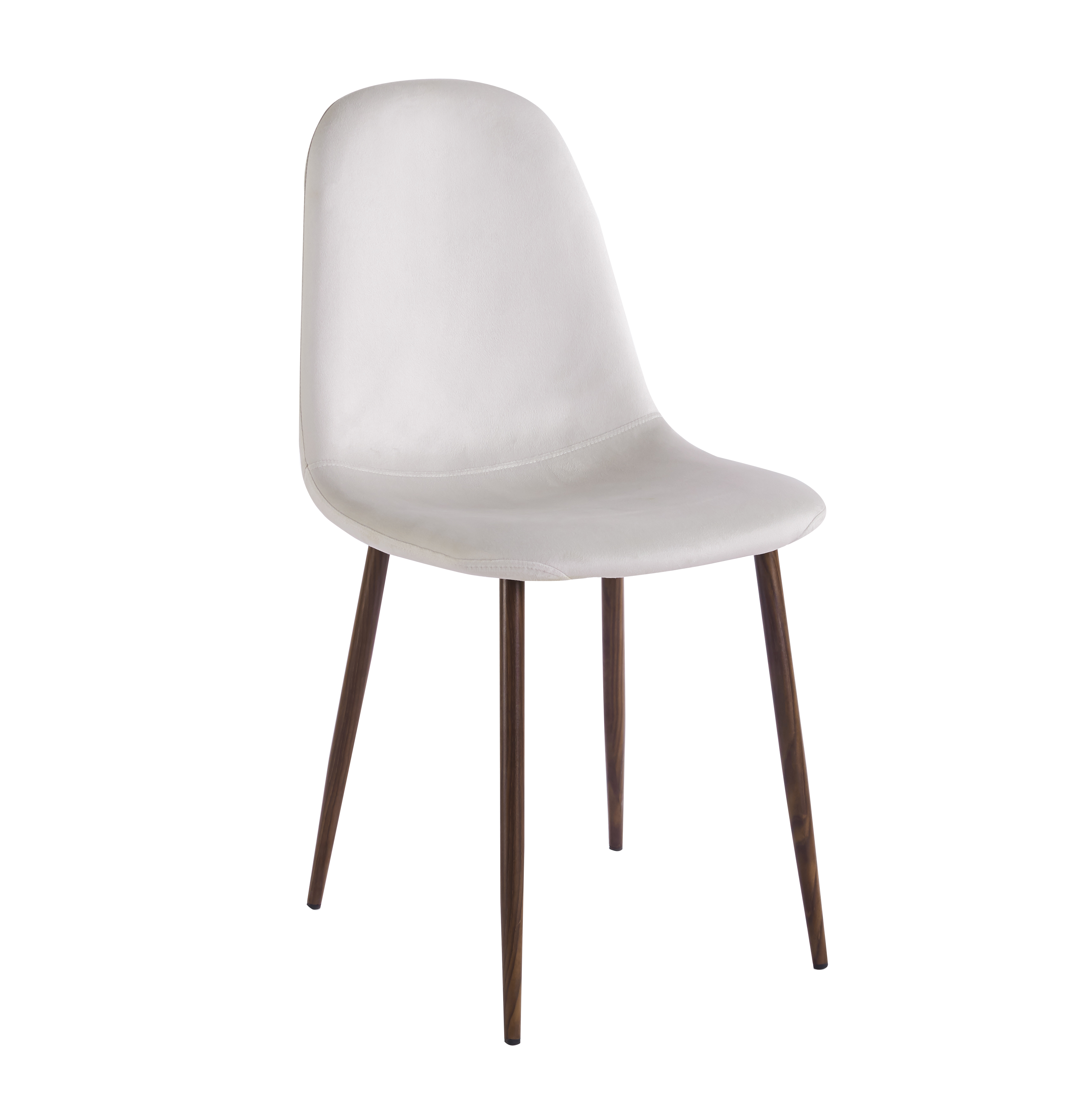 De två Alfred matstolarna kompletterar bordet med sin moderna form och sitt mjuka sammetstyg i beige nyans. De mörkbrunfolierade metallbenen i valnötslook harmonierar fint med bordets yta och skapar en enhetlig och elegant helhet. Stolarna erbjuder bekväm sittkomfort och en design som passar lika bra i klassiska som moderna inredningar.