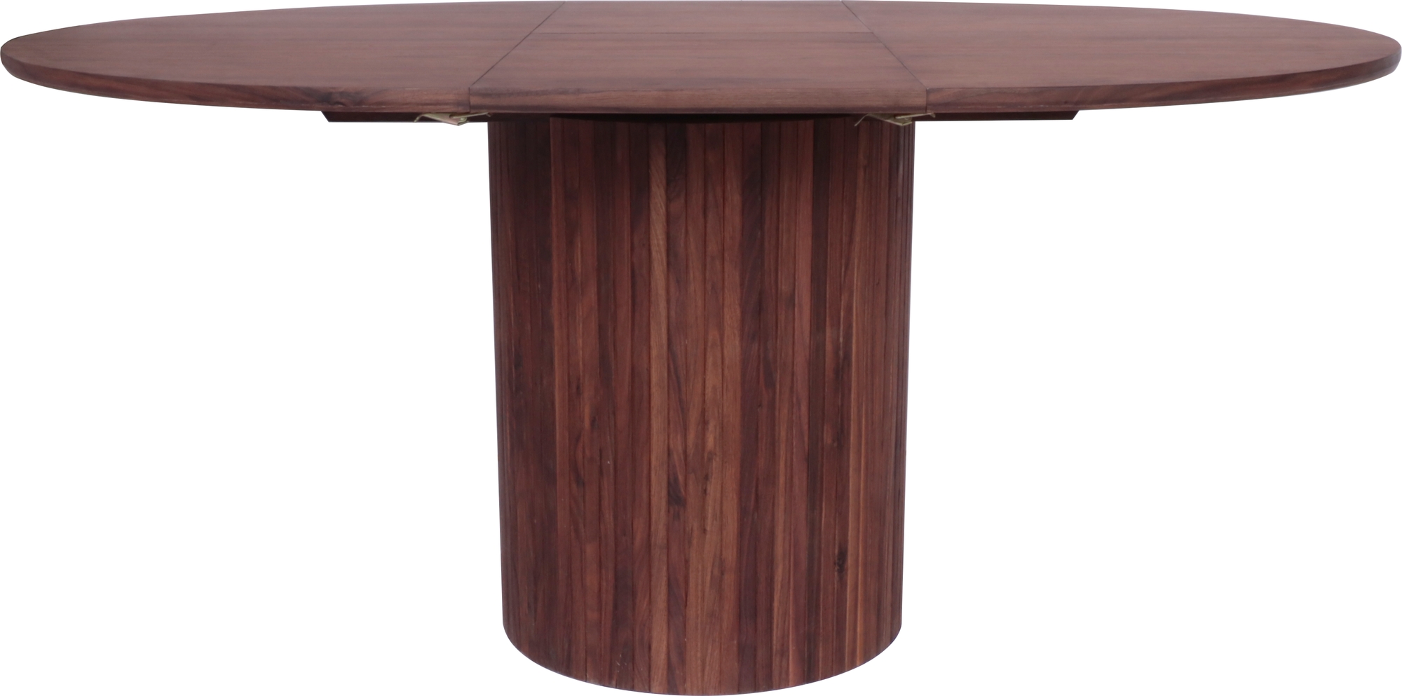 Detta runda matbord i elegant valnöt har en diameter på 115 cm och levereras med en smart, vikbar iläggsskiva som enkelt förlänger bordet till 160 cm. När iläggsskivan inte används förvaras den praktiskt i bordets mittdel. Tillverkat i en kombination av massivt trä och fanér för både hållbarhet och ett sofistikerat utseende.