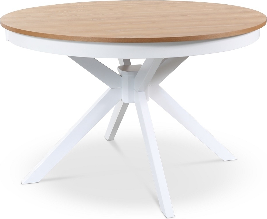 Tromsö matgrupp från Skånska Möbelhuset, runt matbord 120 cm i diameter med vitt underrede och en toppskiva i oljad ekfanèr. Det ingår fyra stycken matchande Danderyd matstolar i svartlackat trä med rottingsits.